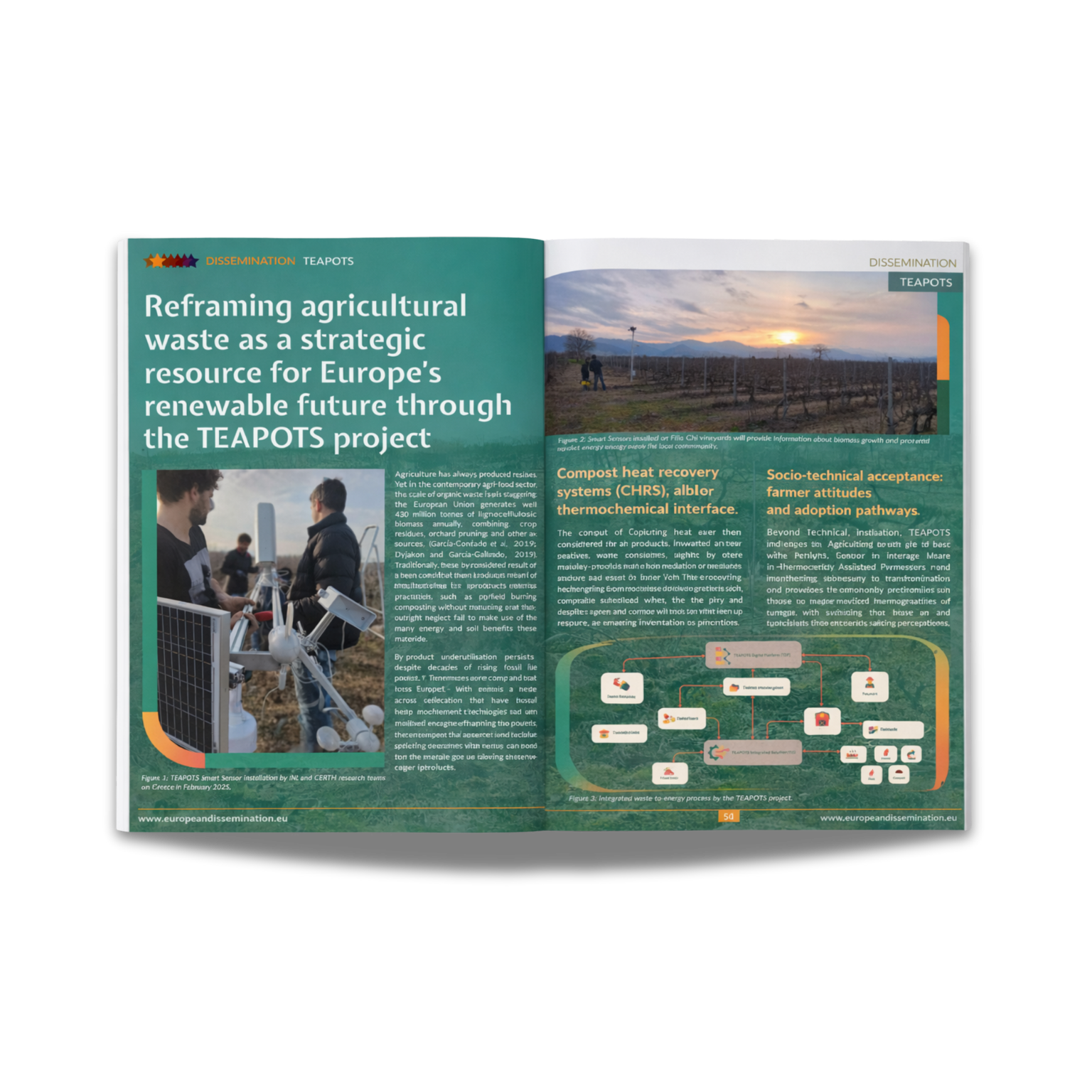 This article presents the TEAPOTS project, which explores how agricultural residues can be transformed into valuable sources of renewable energy, heat, and soil-enhancing by-products. By combining compost heat recovery systems, pyrolysis technologies, and satellite-based biomass mapping, TEAPOTS demonstrates a decentralised, circular approach to waste valorisation. The project highlights both technical performance and socio-economic acceptance, offering scalable solutions that support energy autonomy, soil restoration, and climate resilience across European agri-food systems.